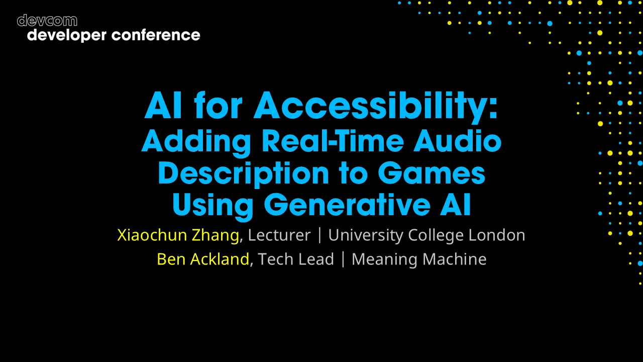 This talk will be the very first presentation of our findings - sharing how we achieved this technological milestone, as well as the human impact this technology has on real players. It will also address the wider question around the potential to use AI for good, not just profit - calling on the industry to step up to the challenge of making video games more accessible, and to enlist cutting edge technologies to make that possible.